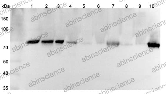Western blot analysis was performed using anti-SEMA3C polyclonal antibody at 1μg/ml on various samples. Lane 1: Raw264.7 cell lysate Lane 2: MCF7 cell lysate Lane 3: PC12 cell lysate Lane 4: Jurkat cell lysate Lane 5: Mouse lung lysate Lane 6: Mouse small intestine lysate Lane 7: Mouse heart lysate Lane 8: Rat lung lysate Lane 9: Rat small intestine lysate Lane 10: Rat heart lysate