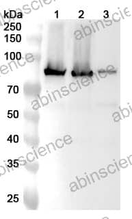 Western blot analysis was performed using anti-TGM2 polyclonal antibody at 1ug/mL on various samples. Lane 1: HUVEC cell lysate Lane 2: BxPC-3 cell lysate Lane 3: A549 cell lysate