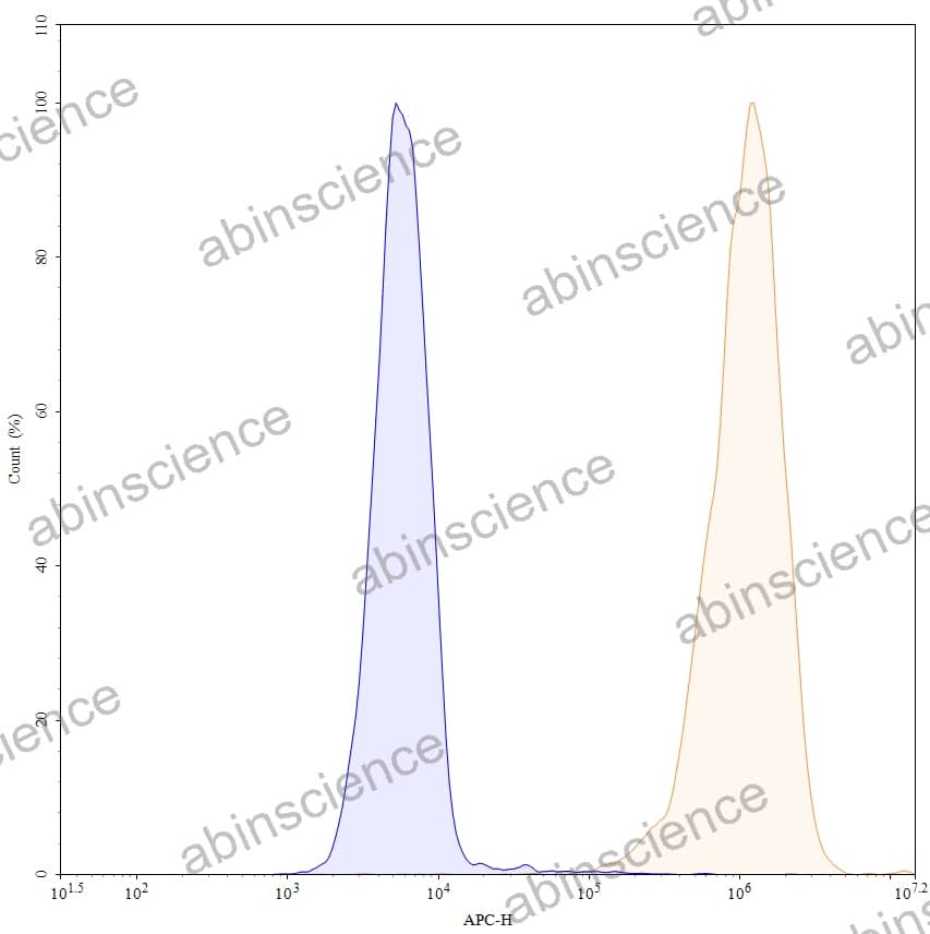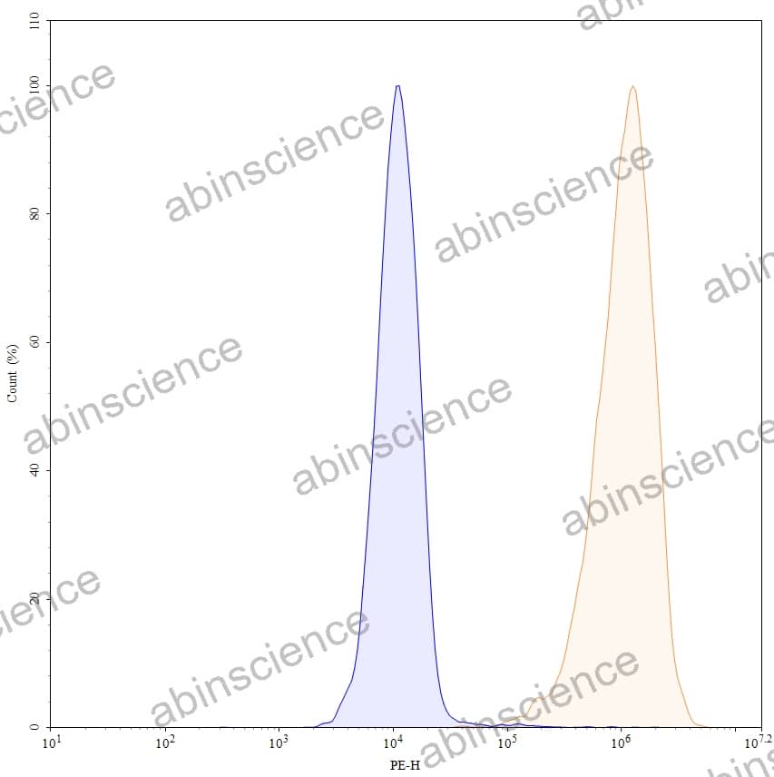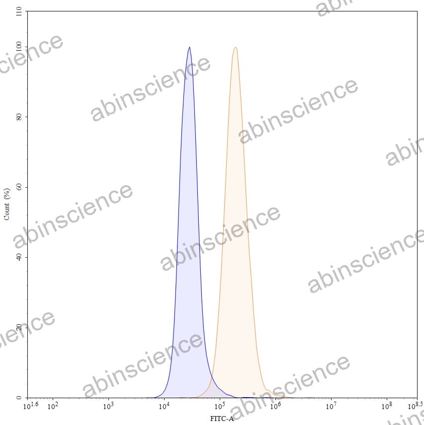 Flow-cytometry using anti-human CD340 antibody. MCF-7 cells were stained with an irrelevant antibody (Blue Histogram) or an anti-human CD340 monoclonal antibody (Catalog HY286036, Yellow Histogram) at a concentration of 5 µg/ml for 30 mins at RT. After washing, bound antibody was detected using a a Goat Anti-Human IgG H&L Polyclonal Antibody, FITC (abinScience: HF690414) and cells analysed on a NovoCyte Flow Cytometer. |