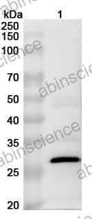 Western blot analysis was performed using anti-H3L polyclonal antibody at 1ug/mL on various samples. Lane 1: recombinant Monkeypox virus/MPXV H3L (Catalog No: VK707012)