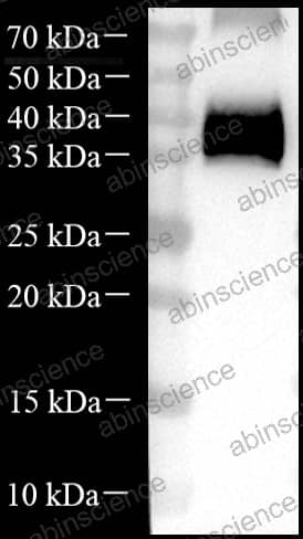 Western blot analysis was performed using anti-monkeypox virus E8L polyclonal antibody at 1ug/mL on recombinant monkeypox virus E8L protein (Catalog No: VK680011). |