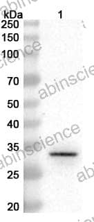 Western blot analysis was performed using anti-LIPASE polyclonal antibody at 1ug/mL on various samples. Lane 1: recombinant Cutibacterium acnes PPA2105/Triacylglycerol lipase (Catalog No: JN871012)
