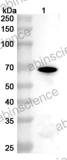 Western blot analysis was performed using anti-HEV-ORF2 polyclonal antibody at 1ug/mL on various samples. Lane 1: recombinant Hepatitis E virus genotype 1/HEV-1 ORF2 (Catalog No: VK620012)