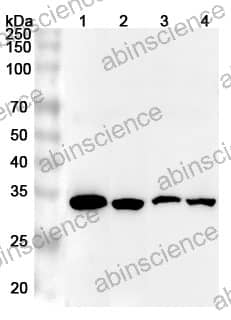 Western blot analysis was performed using anti-ELAVL1 polyclonal antibody at 1ug/mL on various samples. Lane 1: Jurkat cell lysate Lane 2: A549 cell lysate Lane 3: K562 cell lysate Lane 4: H1299 cell lysate