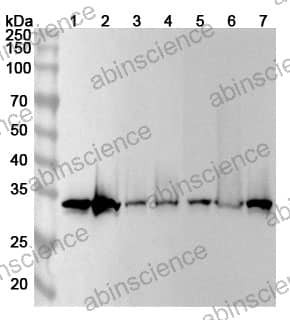Western blot analysis was performed using anti-ELAVL1 polyclonal antibody at 1ug/mL on various samples. Lane 1: A431 cell lysate Lane 2: Jurkat cell lysate Lane 3: Hela cell lysate Lane 4: A549 cell lysate Lane 5: N2A cell lysate Lane 6: K562 cell lysate Lane 7: H1299 cell lysate
