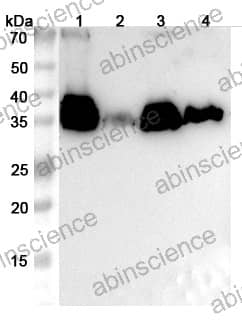 Western blot analysis was performed using anti-penl1 polyclonal antibody at 1μg/ml on various samples. Lane 1: Mouse skeletal muscle lysate Lane 2: Mouse heart lysate Lane 3: Rat skeletal muscle lysate Lane 4: Rat heart lysate