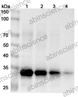 Western blot analysis was performed using anti-Ebola virus Nucleoprotein polyclonal antibody at 1μg/ml on various samples. Lane 1: recombinant Zaire ebolavirus NP/Nucleoprotein (Catalog No: VK512012), 70 ug Lane 2: recombinant Zaire ebolavirus NP/Nucleoprotein (Catalog No: VK512012), 50 ug Lane 3: recombinant Zaire ebolavirus NP/Nucleoprotein (Catalog No: VK512012), 30 ug Lane 4: recombinant Zaire ebolavirus NP/Nucleoprotein (Catalog No: VK512012), 10 ug