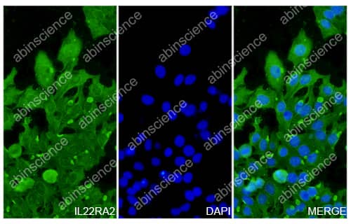 HepG2 cells were fixed with 4% paraformaldehyde for 20 minutes, followed by blocking with 5% goat serum for 1 hour. The cells were then incubated with a primary antibody targeting IL22RA2 (HV100014) at a concentration of 29.2 ug/ml overnight at 4°C. Afterward, the cells were incubated with a secondary antibody, Goat Anti-Rabbit IgG (Alexa Fluor-488) for 50 minutes at room temperature. The localization of IL22RA2 was visualized (shown in green), and nuclear DNA was stained with DAPI (shown in blue). |