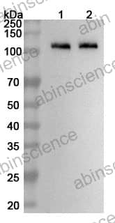 Western blot analysis was performed using anti-DPP6 polyclonal antibody at 1ug/mL on various samples. Lane 1: Rat brain lysate Lane 2: Rat cerebellum lysate