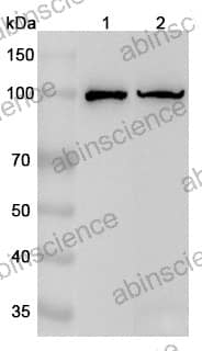 Western blot analysis was performed using anti-CD68 polyclonal antibody at 1μg/ml on various samples. Lane 1: THP-1 cell lysate Lane 2: Jurkat cell lysate