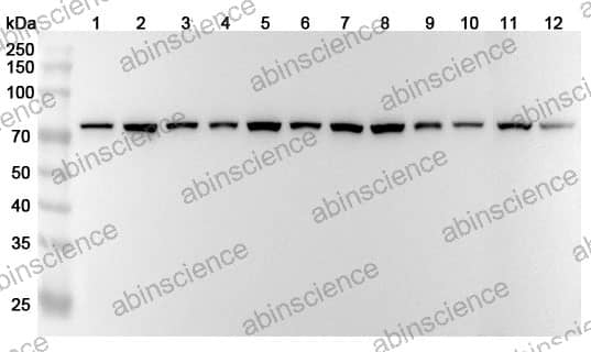 Western blot analysis was performed using anti-HSPA8 polyclonal antibody at 1µg/ml on various samples. Lane 1: 4T1 cell lysate Lane 2: MCF-7 cell lysate Lane 3: PC-12 cell lysate Lane 4: NIH3T3 cell lysate Lane 5: Hela cell lysate Lane 6: U87 cell lysate Lane 7: Jurkat cell lysate Lane 8: HepG2 cell lysate Lane 9: A549 cell lysate Lane 10: Mouse brain lysate Lane11: Rat brain lysate Lane12: Rat heart lysate