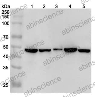 Western blot analysis was performed using anti-IL1RL1 polyclonal antibody at 1µg/ml on various samples. Lane 1: Hela cell lysate Lane 2: SGC-7901 cell lysate Lane 3: HUVEC cell lysate Lane 4: HepG2 cell lysate Lane 5: Mouse brain lysate