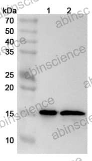 Western blot analysis was performed using anti-IL36B polyclonal antibody at 1µg/ml on various samples. Lane 1: A549 cell lysate Lane 2: 293T cell lysate
