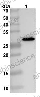 Western blot analysis was performed using anti-ASFV p72/B646L polyclonal antibody at 1ug/mL on recombinant ASFV p72/B646L (Catalog No. VK594012). |