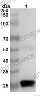 Western blot analysis was performed using anti-Bordetella pertussis ptxA/PTXS1 polyclonal antibody at 1ug/mL on recombinant Bordetella pertussis ptxA/PTXS1 (Catalog No. JN968012). |