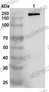 Western blot analysis was performed using anti-ACE polyclonal antibody at 1ug/mL on various samples. Lane 1: Mouse lung lysate
