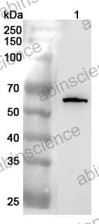 Western blot analysis was performed using anti-CD55 polyclonal antibody at 1ug/mL on various samples. Lane 1: 293T cell lysate