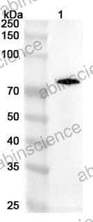 Western blot analysis was performed using anti-HPC46-L1 polyclonal antibody at 1ug/mL on various samples. Lane 1: recombinant HPV16 L1/Major capsid protein L1 (Catalog No: VK461022)