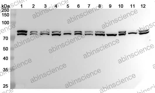 Western blot analysis was performed using anti-HSPA5 polyclonal antibody at 1ug/mL on various samples. Lane 1: HepG2 cell lysate Lane 2: NIH3T3 cell lysate Lane 3: 4T1 cell lysate Lane 4: MCF-7 cell lysate Lane 5: Jurkat cell lysate Lane 6: PC-12 cell lysate Lane 7: Hela cell lysate Lane 8: A549 cell lysate Lane 9: Mouse brain lysate Lane 10: Mouse liver lysate Lane11: Rat brain lysate Lane12: Rat liver lysate