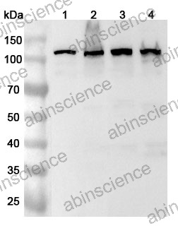 Western blot analysis was performed using anti-SART1 polyclonal antibody at 1ug/mL on various samples. Lane 1: Jurkat cell lysate Lane 2: MOLT-4 cell lysate Lane 3: Raji cell lysate Lane 4: A549 cell lysate
