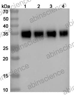 Western blot analysis was performed using anti-CD5 monoclonal antibody at 1μg/ml on various samples. Lane 1: recombinant human CD5 (Catalog No: HY046011), 50ng Lane 2: recombinant human CD5 (Catalog No: HY046011), 30ng Lane 3: recombinant human CD5 (Catalog No: HY046011), 20ng Lane 4: recombinant human CD5 (Catalog No: HY046011), 10ng