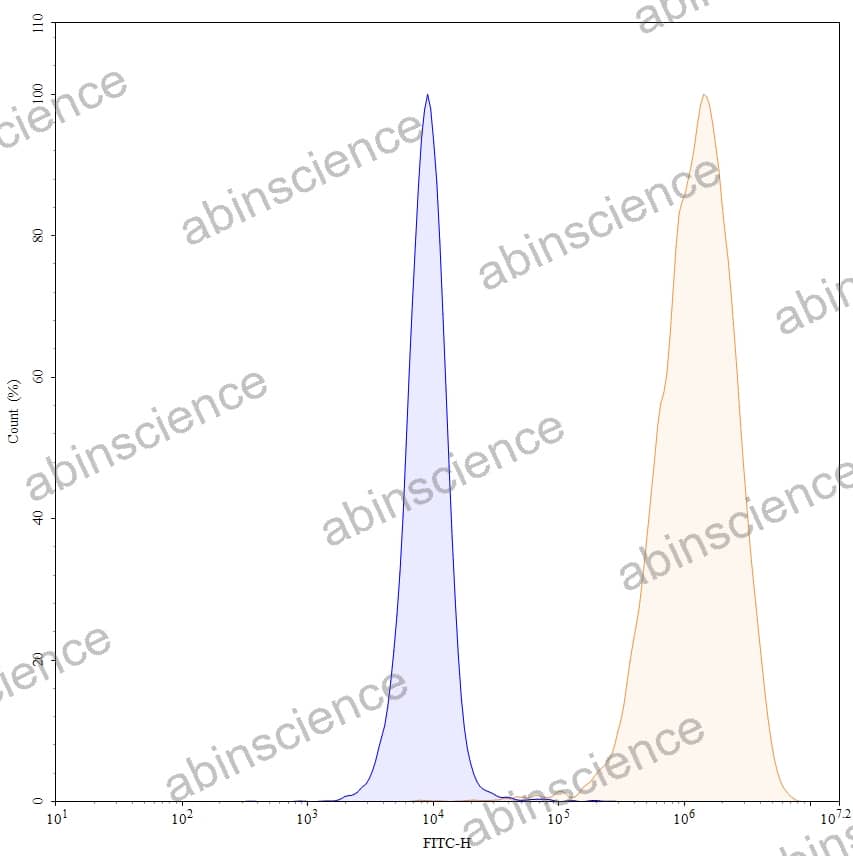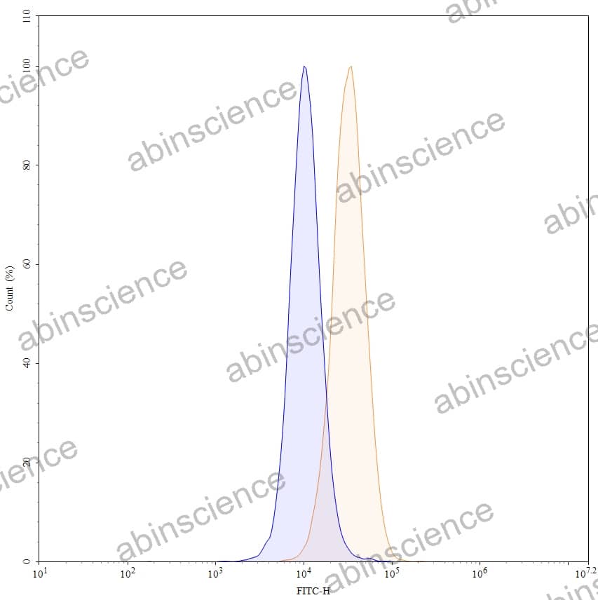 Flow-cytometry using anti-human CD274 antibody. Untransfected cells (blue Histogram) and Transfected cells (Yellow Histogram) were stained with an anti-human CD274 monoclonal antibody (Catalog HV974036) at a concentration of 5 µg/ml for 30 mins at RT. After washing, bound antibody was detected using a Goat Anti-Human IgG H&L Polyclonal Antibody, FITC (abinScience: HF690414) and cells analysed on a NovoCyte Flow Cytometer. |