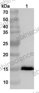 Western blot analysis was performed using anti-2-EP153R polyclonal antibody at 1ug/mL on various samples. Lane 1: recombinant ASFV EP153R (Catalog No: VK462012)