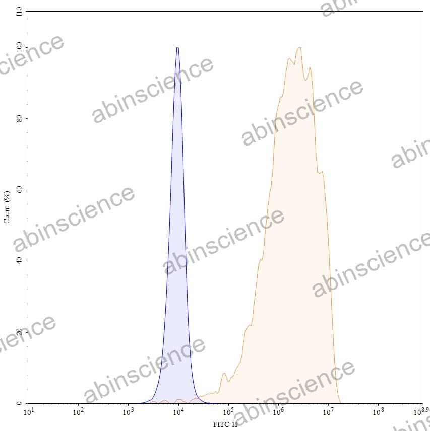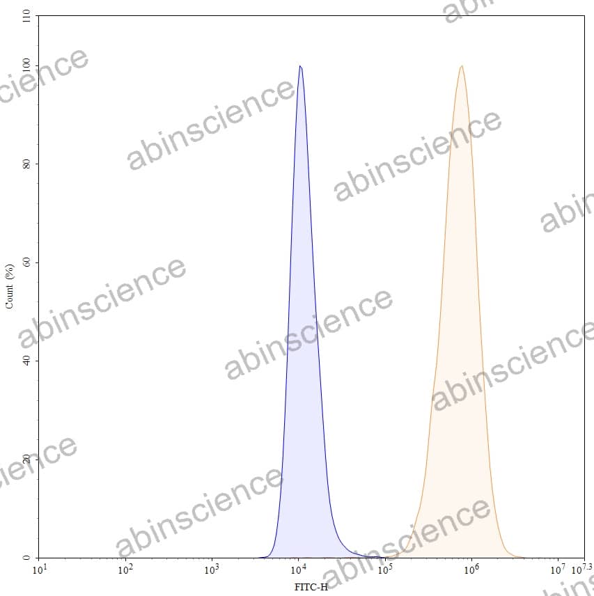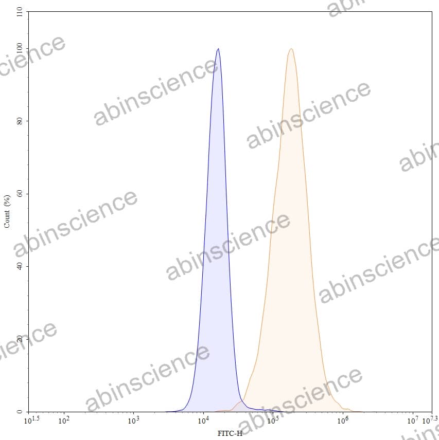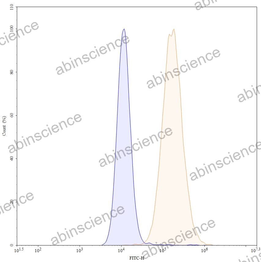 Flow-cytometry using anti-human TACSTD2 antibody. Untransfected cells (blue Histogram) and Transfected cells (Yellow Histogram) were stained with an anti-human TACSTD2 monoclonal antibody (Catalog HY373016) at a concentration of 5 µg/ml for 30 mins at RT. After washing, bound antibody was detected using a Goat Anti-Human IgG H&L Polyclonal Antibody, FITC (abinScience: HF690414) and cells analysed on a NovoCyte Flow Cytometer. |