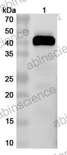 Western blot analysis was performed using anti-Chicken Gal d 2/OVA/Ovalbumin polyclonal antibody at 1ug/mL on recombinant Chicken Gal d 2/OVA/Ovalbumin (Catalog No. GP552012). |