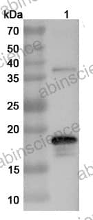 Western blot analysis was performed using anti-ASP f1 polyclonal antibody at 1ug/mL on various samples. Lane 1: recombinant Aspergillus fumigatus Asp f 1/mitF (Catalog No: JN887012)