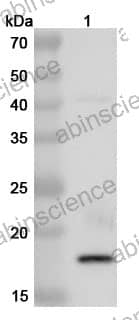 Western blot analysis was performed using anti-Soybean Gly m 4/PR-10 polyclonal antibody at 1ug/mL on recombinant Soybean Gly m 4/PR-10 (Catalog No. PR121012). |