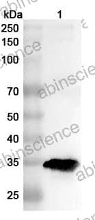 Western blot analysis was performed using anti-PEDV Nsp5/Mpro/3CL polyclonal antibody at 1ug/mL on recombinant PEDV Nsp5/Mpro/3CL (Catalog No. VK564082). |