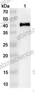 Western blot analysis was performed using anti-NA-H1N1 polyclonal antibody at 1ug/mL on various samples. Lane 1: recombinant Influenza A virus (H1N1) NA/Neuraminidase (Catalog No: VK496062)