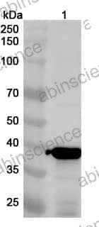 Western blot analysis was performed using anti-F-PIV5 polyclonal antibody at 1ug/mL on various samples. Lane 1: recombinant PIV5 F/Fusion glycoprotein F0 (Catalog No: VK583012)