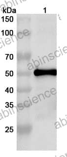 Western blot analysis was performed using anti- polyclonal antibody at 1ug/mL on various samples. Lane 1: recombinant CHPV G/Glycoprotein (Catalog No: VK396012)