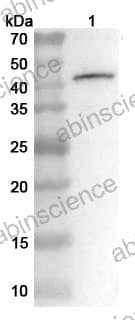 Western blot analysis was performed using anti-SA14E1218 polyclonal antibody at 1ug/mL on various samples. Lane 1: recombinant JEV Envelope protein E (Catalog No: VK731042)