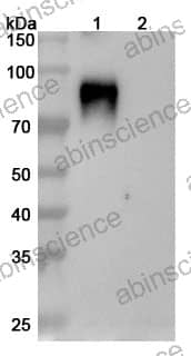 Western blot analysis was performed using anti-Hendra virus Glycoprotein G monoclonal antibody at 1ug/mL on various samples. Lane 1: recombinant Hendra virus Glycoprotein G (Catalog No: VK685011) Lane 2: negative control