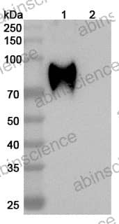 Western blot analysis was performed using anti-Hendra virus Glycoprotein G monoclonal antibody at 1ug/mL on various samples. Lane 1: recombinant Hendra virus Glycoprotein G (Catalog No: VK685011) Lane 2: negative control