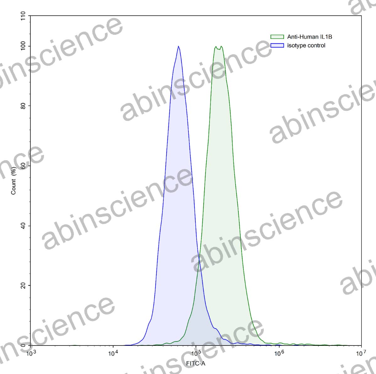 Flow-cytometry using anti-human IL1B antibody.HeLa cells were stained with an irrelevant antibody (Blue Histogram) or an anti-human IL1B antibody monoclonal antibody (Catalog # HF943010 ,Green Histogram) at a concentration of 5 µg/ml for 30 mins at RT. After washing, bound antibody was detected using a FITC conjugated goat anti-human antibody (Catalog # HF690414) and cells analysed on a NovoCyte Flow Cytometer. |