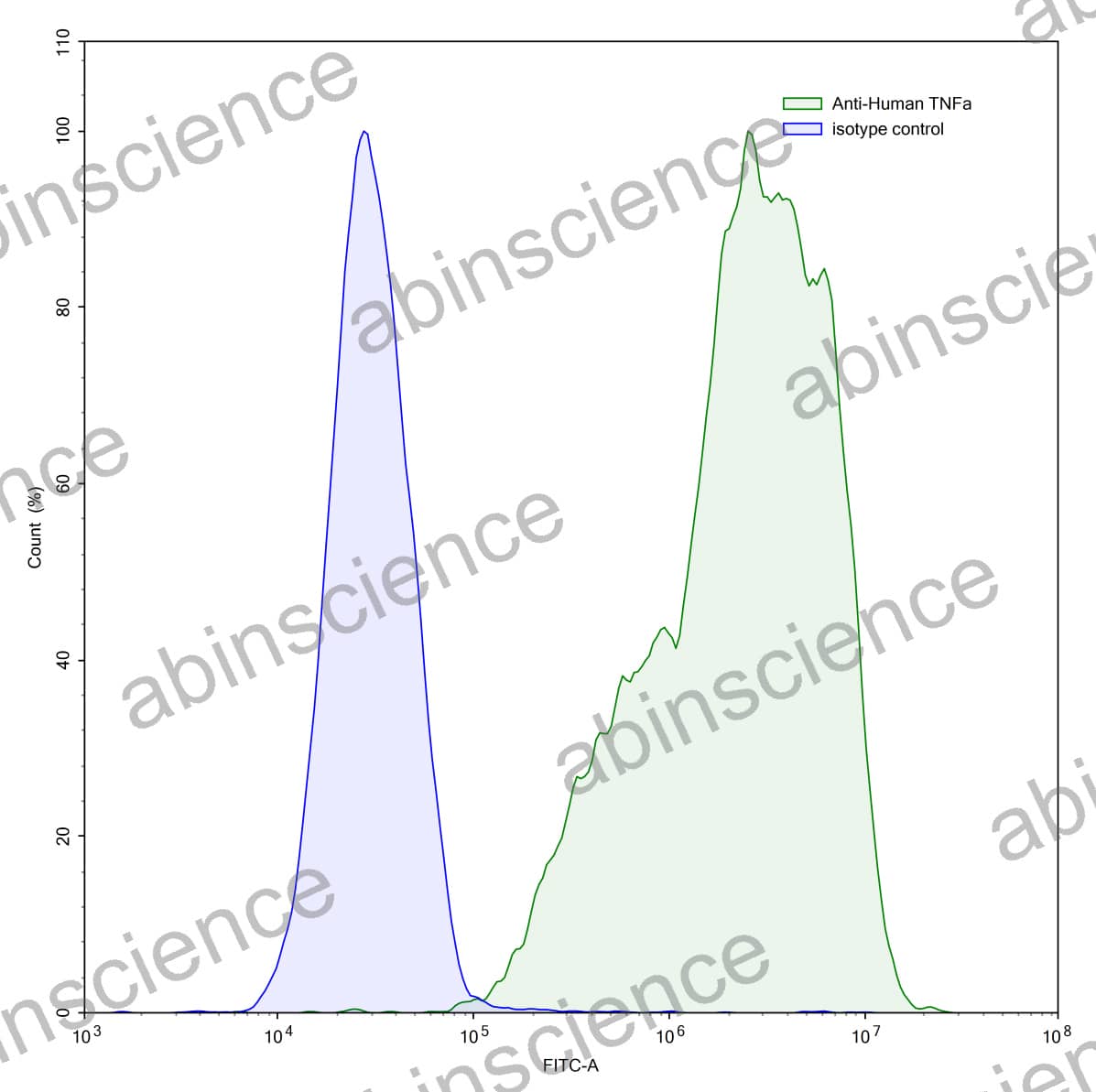 Flow-cytometry using anti-human TNFa antibody.TNFa Transfected CHO cells were stained with an irrelevant antibody (Blue Histogram) or an anti-human TNFa antibody monoclonal antibody (Catalog # HF879010 ,Green Histogram) at a concentration of 5 µg/ml for 30 mins at RT. After washing, bound antibody was detected using a FITC conjugated goat anti-human antibody (Catalog # HF690414) and cells analysed on a NovoCyte Flow Cytometer. |