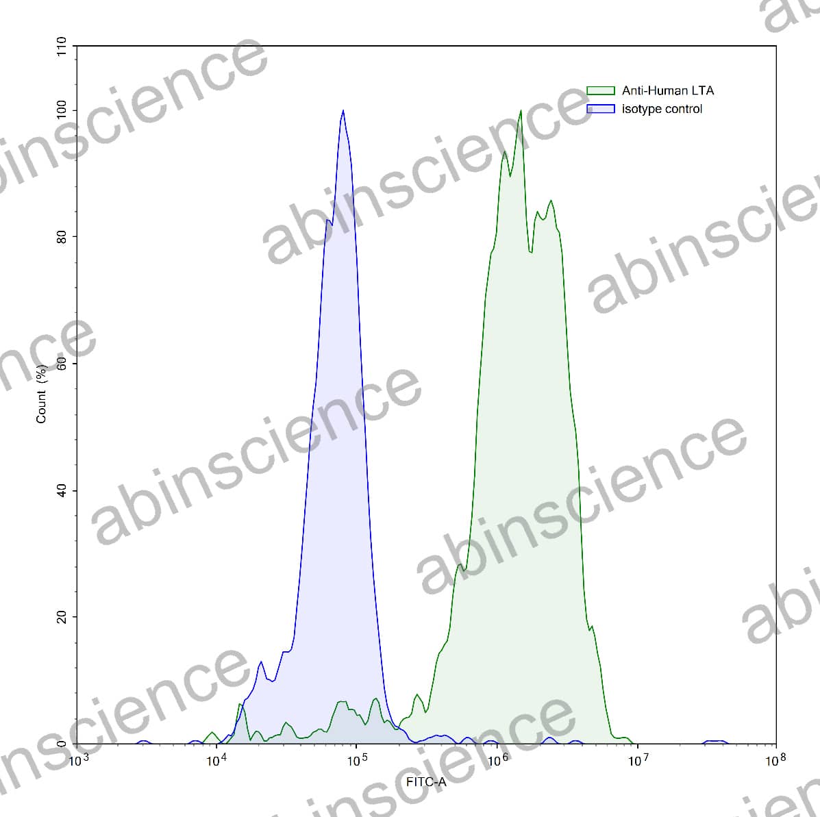 Flow-cytometry using anti-human LTA antibody.LTA/TNF-beta Transfected SF9 cells were stained with an irrelevant antibody (Blue Histogram) or an anti-human LTA antibody monoclonal antibody (Catalog # HF686010 ,Green Histogram) at a concentration of 5 µg/ml for 30 mins at RT. After washing, bound antibody was detected using a FITC conjugated goat anti-human antibody (Catalog # HF690414) and cells analysed on a NovoCyte Flow Cytometer. |