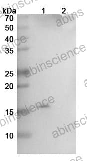 Western blot analysis was performed using anti-GREM1 monoclonal antibody at 1ug/mL on various samples. Lane 1: recombinant human GREM1 (Catalog No: HT246011) Lane 2: negative control