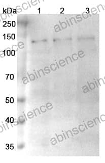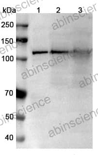 Western blot analysis was performed using anti-TRPM4 polyclonal antibody at 1μg/ml on various samples. Lane 1: Jurkat cell lysate Lane 2: PC12 cell lysate Lane 3: Rat brain lysate