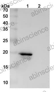 Western blot analysis was performed using anti-SNCA monoclonal antibody at 1µg/ml on various samples. Lane 1: recombinant human SNCA (Catalog No: HW755012) Lane 2: negative control