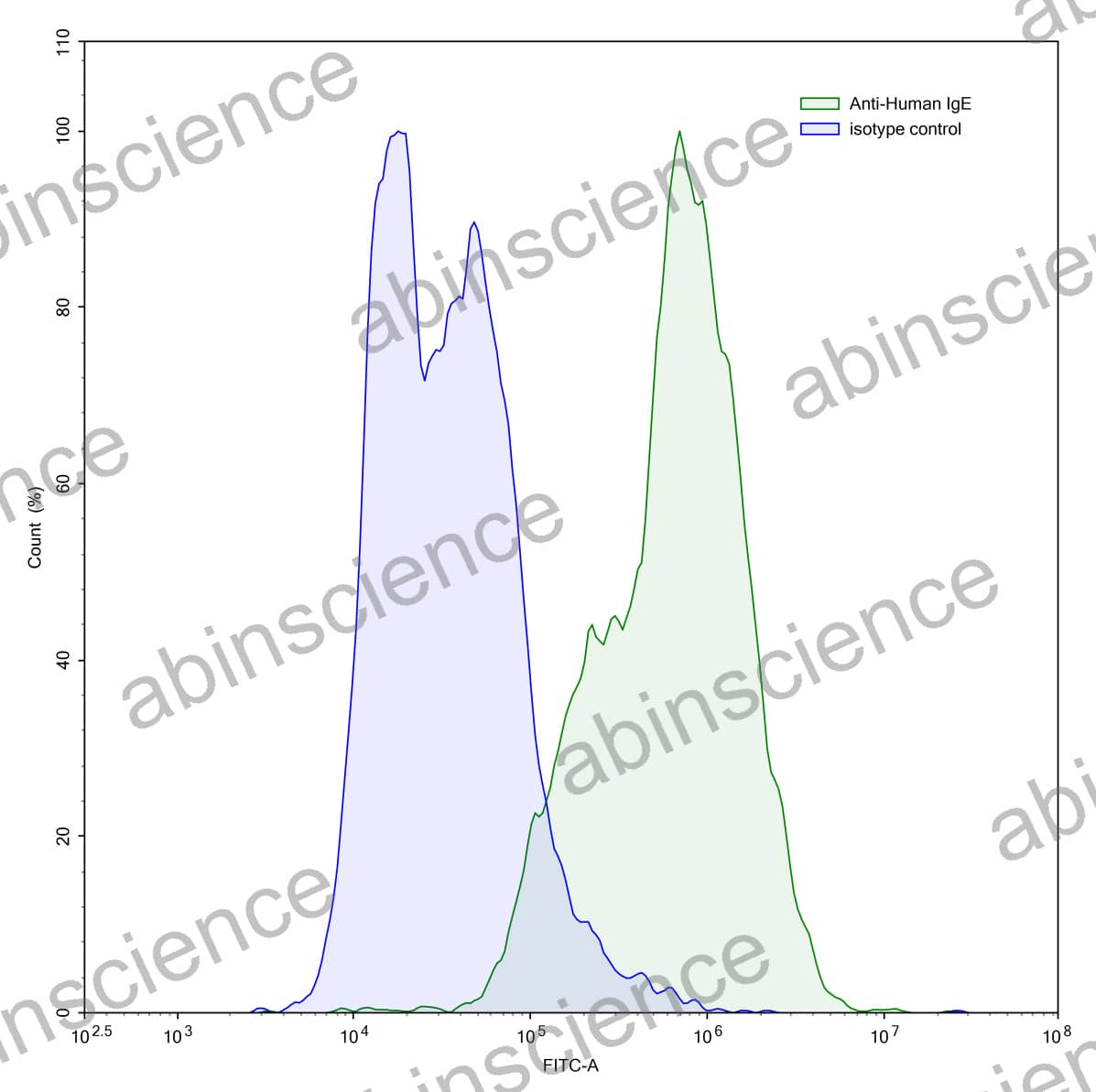 Flow-cytometry using anti-human IgE antibody.IgE Transfected CHO cells were stained with an irrelevant antibody (Blue Histogram) or an anti-human IgE antibody monoclonal antibody (Catalog # HV064023 ,Green Histogram) at a concentration of 5 µg/ml for 30 mins at RT. After washing, bound antibody was detected using a FITC conjugated goat anti-mouse antibody (Catalog # MF690414) and cells analysed on a NovoCyte Flow Cytometer. |