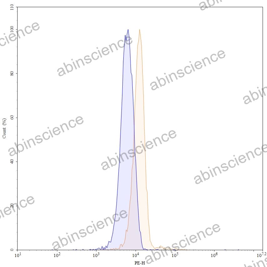 Flow-cytometry using PE anti-human BCL2 antibody. A549 cells were fixed and permeabilized, then stained with an irrelevant antibody (Blue Histogram) or an PE anti-human BCL2 monoclonal antibody (Catalog: HY131023, Yellow Histogram) at a concentration of 5 µg/ml for 30 mins at RT. After washing, cells analysed on a NovoCyte Flow Cytometer. |