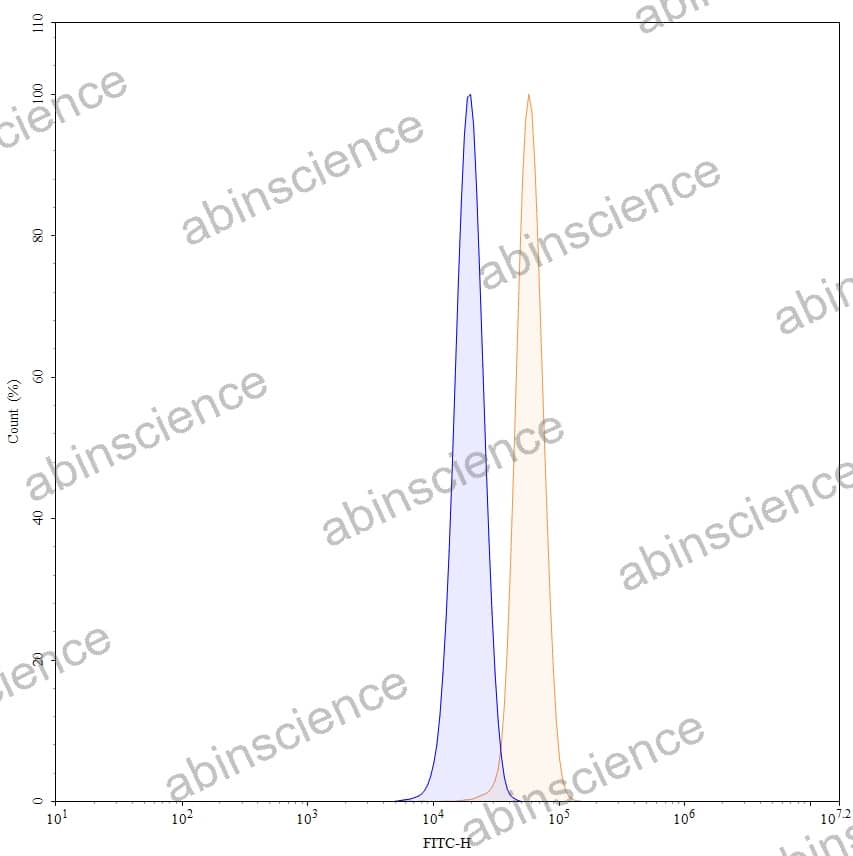Flow-cytometry using FITC anti-human BCL2 antibody. A549 cells were fixed and permeabilized, then stained with an irrelevant antibody (Blue Histogram) or an FITC anti-human BCL2 monoclonal antibody (Catalog: HY131023, Yellow Histogram) at a concentration of 5 µg/ml for 30 mins at RT. After washing, cells analysed on a NovoCyte Flow Cytometer. |