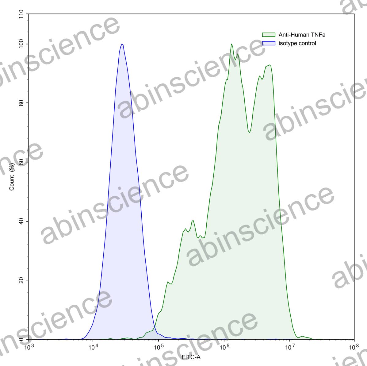 Flow-cytometry using anti-human TNFa antibody.TNFa Transfected CHO cells were stained with an irrelevant antibody (Blue Histogram) or an anti-human TNFa antibody monoclonal antibody (Catalog # HF879053 ,Green Histogram) at a concentration of 5 µg/ml for 30 mins at RT. After washing, bound antibody was detected using a FITC conjugated goat anti-human antibody (Catalog # HF690414) and cells analysed on a NovoCyte Flow Cytometer. |