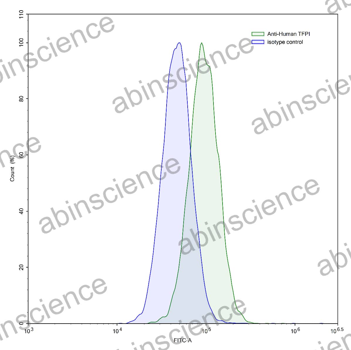 Flow-cytometry using anti-human TFPI antibody.HepG2 cells were stained with an irrelevant antibody (Blue Histogram) or an anti-human TFPI antibody monoclonal antibody (Catalog # HY403013 ,Green Histogram) at a concentration of 5 µg/ml for 30 mins at RT. After washing, bound antibody was detected using a FITC conjugated goat anti-human antibody (Catalog # HF690414) and cells analysed on a NovoCyte Flow Cytometer. |