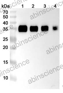 Western blot analysis was performed using anti-CD274/PD-L1/B7-H1 monoclonal antibody at 1μg/ml on various samples. Lane 1: recombinant mouse CD274/PD-L1/B7-H1 (Catalog No: MV974011), 50ng Lane 2: recombinant mouse CD274/PD-L1/B7-H1 (Catalog No: MV974011), 30ng Lane 3: recombinant mouse CD274/PD-L1/B7-H1 (Catalog No: MV974011), 20ng Lane 4: recombinant mouse CD274/PD-L1/B7-H1 (Catalog No: MV974011), 10ng